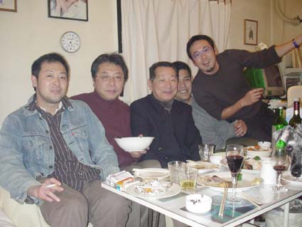 夜は、親方の全快祝い(?)にタイペーちゃんと3人でラブリーへ。ピンクボンゴでお世話になってる中島徹さんと竹田龍彦さんが演奏してるので行ってきました。最初のステージを聴いた後でキャバレロへ。中島さんと竹田さんが来るのを待っていたかったのですが、今度は私が風邪ぎみで、私だけ先に帰宅。深夜、皆で(っていうかチカちゃんが)食べまくったようです。↓遊びに来ていた大村君と皆で記念撮影。
