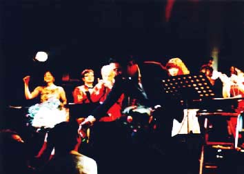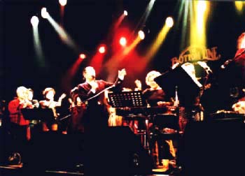 それからBOSSが『イパネマの娘』を歌い始めました。フィナ-レです。出演者全員がステ-ジに出てきました。BOSSの後、ひとみさんが歌い、クミちゃんが歌い、遊びに来てくれたサミーさんが歌い、赤崎さんが歌い、ミチルさんが歌い...............。皆で歌い、演奏し、踊りました。胸がいっぱいになりました。リズムがアップテンポにかわるなか、ギターを置いて立ち上がったBOSSが全員を紹介していきました。「ギター畑ひろし、パーカッション木村キムチ誠、ルベンフィゲロア、今福健司、ヒラータフミト、ダニー、高橋ゲタ夫、B.C.Q.オリジナルメンバー丸市、渋谷みちる、トロンボーン中島徹、パーカッション宮本大路、メグ末岡、サミー(?)、宮崎カポネ信義、植田ひとみ、平野クミ、赤崎真由美、八木のぶお、ロドリゲス山本隆詞、ベース名古路一也、岸、ピアノ大口純一郎、今日の司会をやってくれましたフライデーナイト山崎、そして、ちちじまうしこ、そして今日のプロデューサーデミ、」最後にメグさんの紹介で「そして、BOSS!!」。客席からBOSSへ花束がたくさん届きました。「これからもキャバレロクラブをよろしくお願いします。次はたぶん、30周年になると思います。」